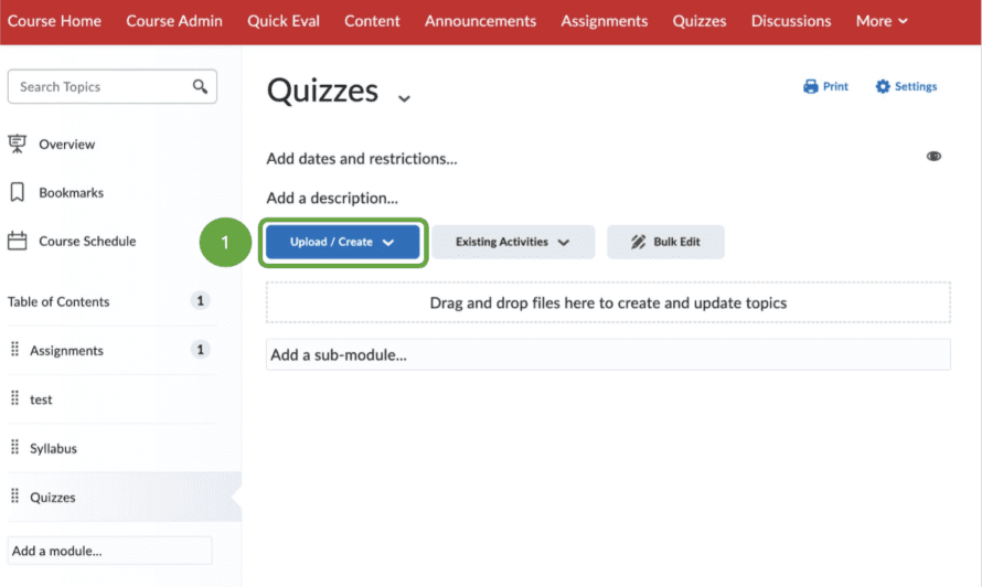 1. In your Brightspace course, go to a content module and click on Upload/Create.